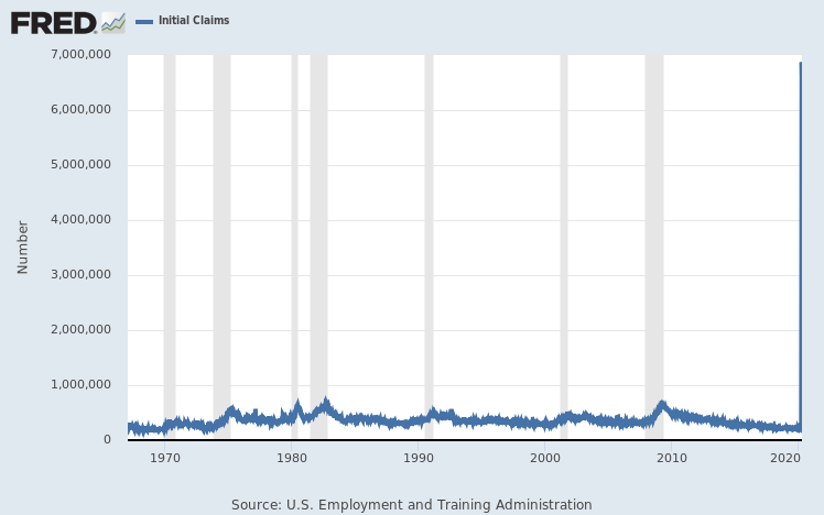 This chart shows the weekly jobless claims, with the recent seven-figure numbers basically breaking the five-decade chart: