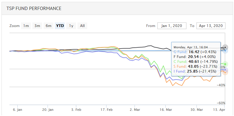 If we look at all five of the TSP funds, the F Fund has been the outperformer year-to-date due to a decline in interest rates (which are good for bond prices):